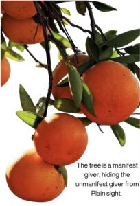 નારંગીનું ઝાડ આપણને દાતા લાગે છે, કારણ કે આપણે તેના ફળો ખાઈએ છીએ, પરંતુ આપણે છુપાયેલા દાતા (ચેતના) ને જોવામાં નિષ્ફળ જઈએ છીએ, જે સૂર્યપ્રકાશ, પાણી અને માટીમાંથી પોષક તત્વો દ્વારા વૃક્ષને પોષણ આપે છે.